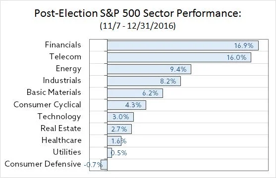 A stark example of this is the performance of the Telecommunications and Financials sectors within the S&P 500; two of the most heavily regulated sectors that have been the focus of significant government scrutiny in recent years. Both increased by over 16% between November 7th and December 31, while the overall index increased by 5.5% over the same time-period.