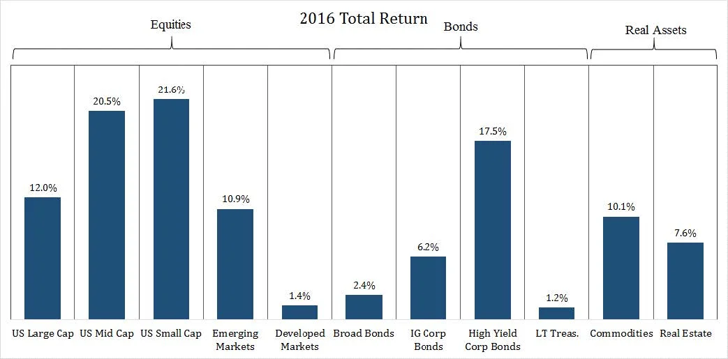 For the year, returns for most investment categories across major asset classes were positive; some with a significant proportion coming in the post-election rally. We regularly measure 11 such categories, all of which exhibited positive returns for the year (see the chart below).