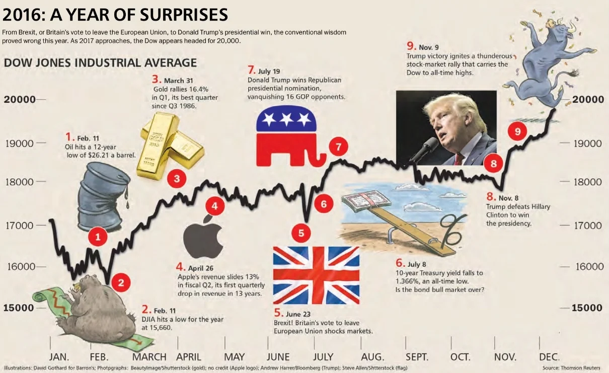 2016 In Review: When we look back on 2016, the most impactful event that comes to mind is the election of Donald Trump as the next President of the United States. Indeed, the market reaction to the election result was significant and almost as surprising as the election result was. But, the chart below from Barron’s magazine does a great job of reminding us of some other events that helped shape the year.